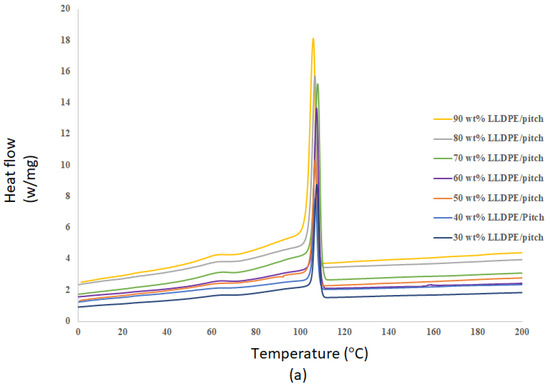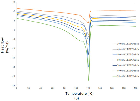 (a) Crystallisation (∆Hc, enthalpy of crystallization, is the area under the exotherm curve) and (b) melting (∆Hm, enthalpy of fusion, is the area under the endotherm curve) of LLDPE/mesophase pitch blends.