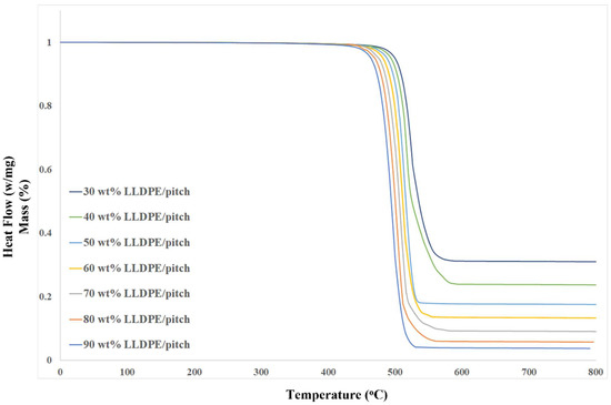 The TGA was performed with temperatures between 100 and 800 °C. Thermal decomposition for a range of LLDPE/MP blends was investigated, and the TGA curves obtained are presented in Figure 7. Figure 7 presents the loss of mass as a function of temperature for the test specimens. We see that the LLDPE/MP blend with 90 wt% LLDPE has suffered severe decomposition at 540 °C with over 90% mass loss. However, the blend with 30 wt% LLDPE shows only 60% mass loss at that temperature. This confirms that MP is more stable than LLDPE, and the wt% LLDPE in the blend influences its thermal stability. The decomposition temperatures of various LLDPE/MP blends are seen in Figure 7. Those fibres with 30 wt% and 40 wt% LLDPE could preserve more than 30% of the fibre mass until about 800 °C. With their decreased brittleness and relatively higher thermal stability, these two blends could provide acceptable precursors for the fabrication of CFs. We also studied the onset decomposition temperature of the samples. The onset degradation temperature is defined as the temperature at which the sample shows 5% initial mass loss. As seen in Table 4, onset degradation temperature also reduced with increasing LLDPE content in the LLDPE/pitch fibres. This observation further supports our initial finding that increased LLDPE content will reduce the thermal stability of the LLDPE/pitch blend.