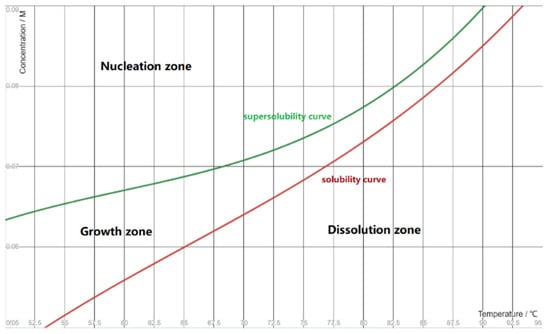 The nucleation and growth concentrations are two key factors to control crystal growth. The temperature-concentration distribution curve of Cs2AgBiBr6 in HBr can be divided into three zones by the solubility curve and supersolubility curve [], as shown in Figure 1.