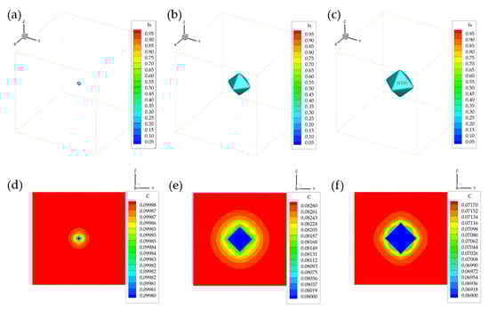 The facet morphology cannot be seen clearly in Figure 2a because it is in the early stage of growth after nucleation. The corresponding solute cross-section figure shows that the solute distribution is quite uniform, and the anisotropy is not relatively distinct. Figure 2b shows that the crystal is in an octahedral shape, and the morphology of facet growth appeared after a period of growth. The corresponding solute cross-section in Figure 2e shows that under the influence of anisotropy and geometric parameters g, the growth of the <111> direction (45° direction) is restrained, and crystal growth occurs along the <100> direction (axial direction). The solute in the <100> direction is poorer than that in the <111> direction, resulting in faster growth in the <111> direction, thus maintaining the facet growth morphology. It can be seen from Figure 2c that the crystal is characterized by four-fold anisotropic symmetry and continues to grow in an octahedral shape.