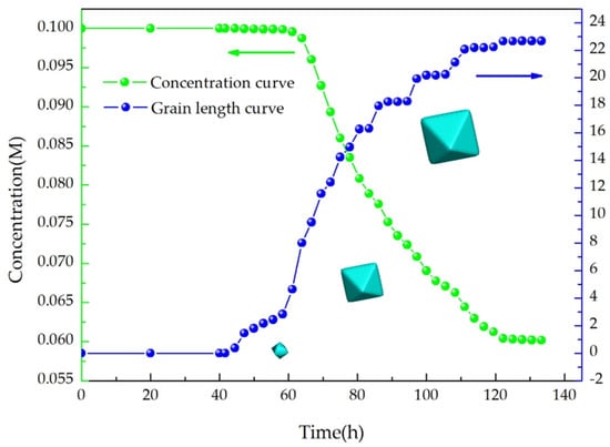 The concentration of solute has a great influence on the process of grain growth. As shown in Figure 3, the grain growth is divided into two stages, namely nucleation and growth. The concentration curve in Figure 3 does not change, and the grain length is 0 before 42 h (about 95 °C). After 42 h, nucleation occurs and enters the growth stage, and the solute concentration decreases with the increase in grain length. It is worth noting that the solute consumption rate has an obvious acceleration process and then gradually slows down. This is due to the increase in solute capture rate at the solid–liquid interface with the cooling growth process, and with the gradual consumption of solute, the supersaturation of solution decreases, which is not enough to maintain rapid growth. When the cooling is stopped, the supersaturation tends to 0, and the solution concentration tends to a certain value.