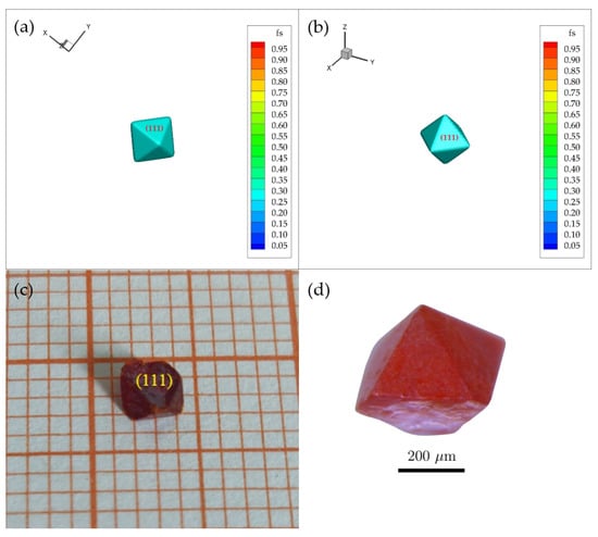 Analysis of the above simulation results shows that the grain will continue to grow with an octahedral morphology. Therefore, in this paper, the simulation results can be approximately compared with the experimental results to verify the rationality and correctness of the model. Figure 4 shows the comparison between simulation results (Figure 4a,b) and experimental results (Figure 4c,d) of Cs2AgBiBr6 single-crystal growth.
