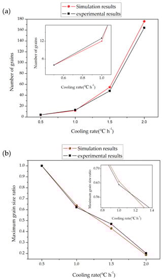 Quantitative comparison between simulation results and experimental results. (a) Cooling rate-number of grains curve (the inset is the detailed view), and (b) cooling rate-maximum grain size ratio curve (the inset is the detailed view).