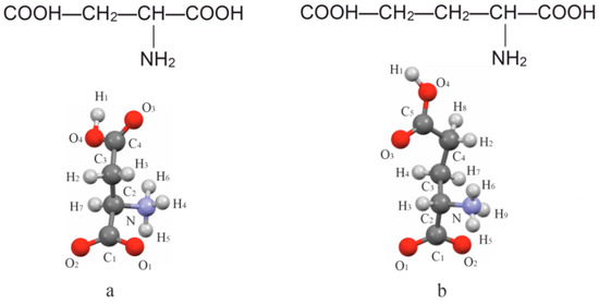 Aspartic acid (C4H7NO4) and glutamic acid (C5H9NO4) are proteinogenic aliphatic amino acids. They are characterized by having two carboxylic COOH groups in their molecules, and differ only in the absence or presence of a CH2 group (Figure 1). Both acids have only one chiral center, i.e., they can exist in two different configurations, referred to as L and D enantiomers. In the event that the enantiomers form a binary equimolar compound, the D and L molecules contribute equally to the formation of the resulting DL crystalline structure. The crystals of L-asp and DL-asp show monoclinic syngony with the space groups P21 and C2/c, respectively [20,21]. The L-glu enantiomer possesses orthorhombic syngony with the space group P212121 [22].