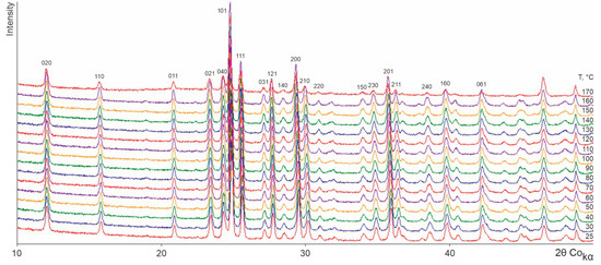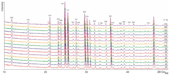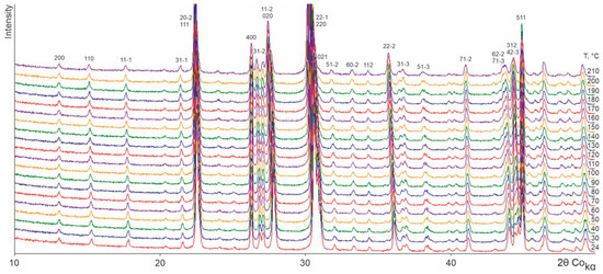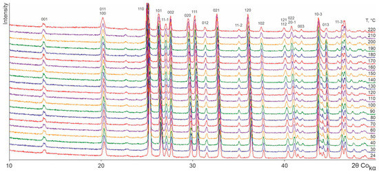 The above-mentioned samples were pre-investigated by means of the PXRD method (Rigaku MiniFlex II, Tokyo, Japan). The behavior of the samples at elevated temperatures was studied using the temperature-resolved powder X-ray diffraction (TRPXRD) technique. The experiments were performed in atmospheric air using a Rigaku Ultima IV (Tokyo, Japan) diffractometer equipped with a high-temperature accessory. The experimental conditions were as follows: CoKα irradiation, 2θ range of 5–50°, and temperature range of 23–220 °C, with a temperature step of 10 °C. The unit cell parameters at each temperature were calculated via the Rietveld method using Topaz software (Bruker AXS GmbH, Karlsruhe, Germany).
