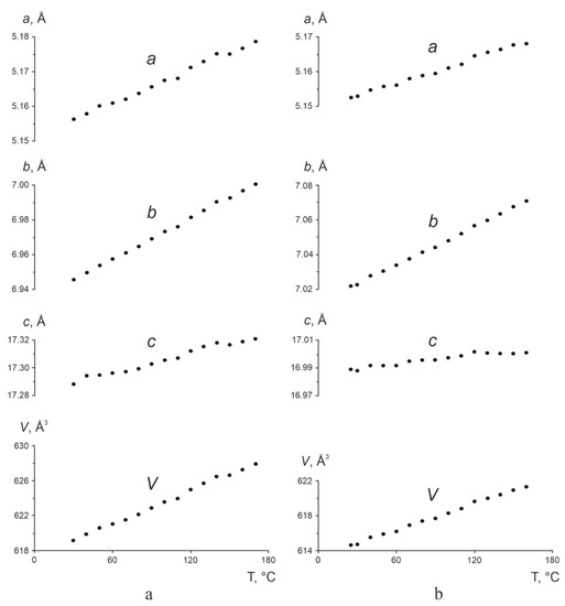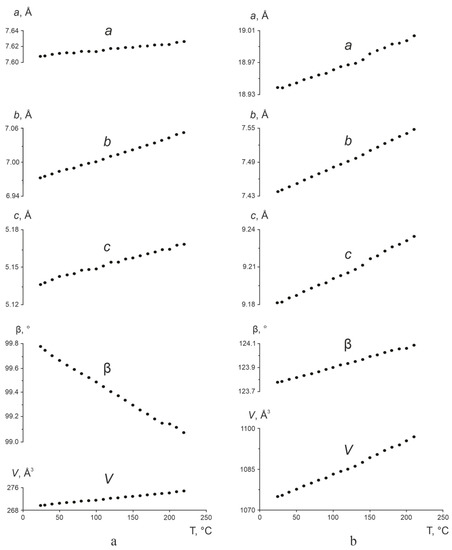 - Filatov, S.; Bubnova, R. The nature of special points on unit cell parameters temperature dependences for crystal substances. Z. Kristallogr. 2007, 26, 447–452. [Google Scholar] [CrossRef]