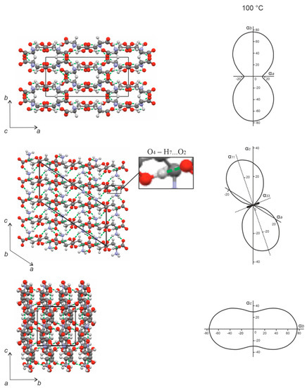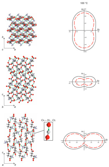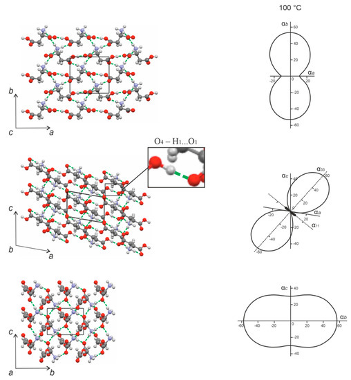 Therefore, at elevated temperatures, the L-asp crystal structure naturally contracts along the direction in which several hydrogen bonds are grouped, including the strongest hydrogen bond: O4–H1…O1. This contraction is accompanied by a diminution in the β angle (see Figure 6a), and is characterized by maximum anisotropy of the thermal deformations within the ac plane (Figure 8).