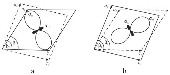 Schematic representation of shear deformation in relation to the figures of the thermal expansion coefficients (α11 and α33) for increased (a) and decreased (b) angle β. Angles β1 and β2 are the monoclinic angles before and after the shear deformation, respectively. The image was plotted with partial use of the data reported in [26].