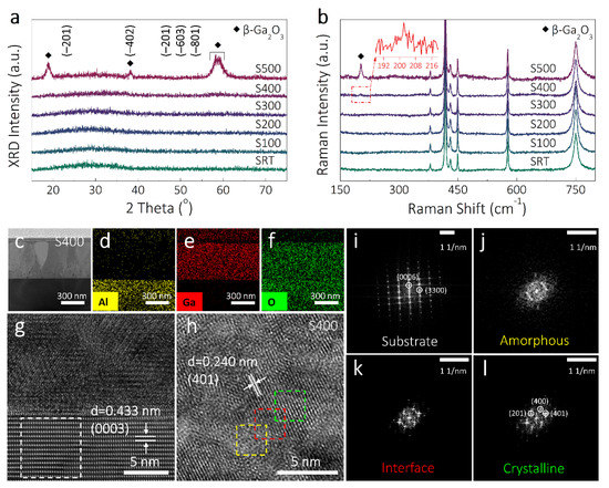 XRD pattern (a) and Raman scattering spectra (b) of Ga2O3 films annealed with different temperatures. (c) The SEM image of the cross-section of mixed-phase Ga2O3 (S400) and the corresponding EDX elemental mapping images of Al (d), Ga (e), and O (f). (g) Cross-sectional TEM image of Ga2O3/c-Al2O3 interface (S400). (h) Magnified HRTEM image of mixed-phase Ga2O3 film, the yellow, red, and green dotted selected areas correspond to the amorphous, interface, and crystalline regions, respectively. FFT pattern of substrate (i), amorphous region (j), amorphous/crystalline interface (k), and crystalline region (l).
