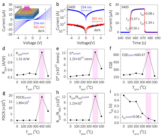 (a) I–V characteristics of mixed-phase Ga2O3 PD (S400) under dark, 365 nm, and 254 nm illumination (the light intensity of 254 nm is 100–700 μW/cm2, and the light intensity of 365 nm is 500 μW/cm2), and the inset shows the structure diagram of MSM structured Ga2O3 PD. (b) I–V characteristics of S400 under dark and illumination with 254 nm/365 nm UV light (500 μW/cm2) on a logarithmic scale. (c) Enlarged view of the single response (blue) of S400 and the corresponding fitted rise and decay times (red). (d–i) Plots of R, D*, EQE, PDCR, R254/R365, and τd1 versus postannealing temperature.