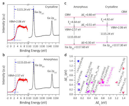 XPS valence band spectra and Ga 2p core level of crystalline (a) and amorphous (b) Ga2O3 films. (c) Schematic illustration of energy band alignment of amorphous/crystalline Ga2O3. (d) Comparison between previously reported conduction and valance band offsets of heterojunction with our amorphous/crystalline Ga2O3 [51,52,54,55,56,57,58,59,60,61,62,63,64].