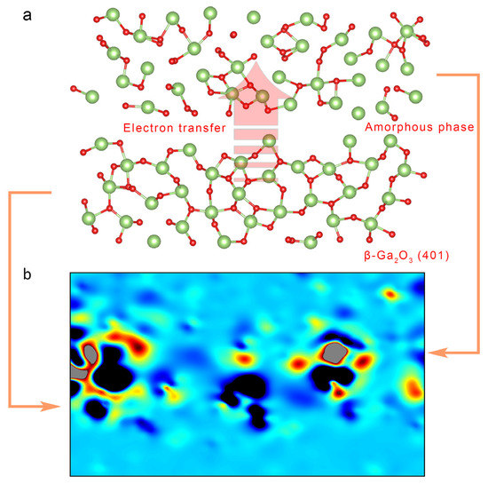 DFT calculations were further performed to explore electronic characteristics of amorphous/crystalline mixed-phase Ga2O3. Based on the aforementioned TEM results, the (401) plane d-spacing was dominated. As such, an interface was constructed with crystalline β-Ga2O3 and amorphous Ga2O3 along (401), as shown in Figure 4a. During the relaxation process, several layers of Ga2O3 atoms near the interface were allowed to interact. To optimize the structure with cutoff energy of 500 eV, the Perdew–Berk–Ernzerhof (PBE) exchange correlation function was used. For the mixed-phase model, the Monkhorst–Pack k-point grid was set to 1 × 11 × 2, and the force threshold was set to 0.01 eV/Å. The energy convergence tolerance was 10−4 eV [65].