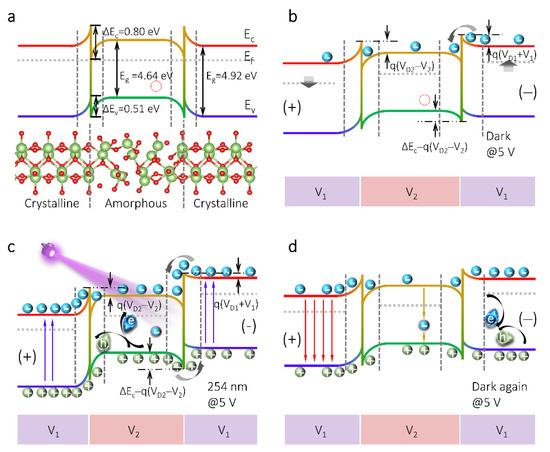 The dark current transport process of mixed-phase Ga2O3 PD under a bias of 5 V is shown in Figure 5b. In general, a large number of oxygen vacancies acting as donor states in the amorphous Ga2O3 is beneficial for prolonging the life of electrons and inducing photoconductivity gain [10]. At the same time, a high density of oxygen vacancies has a high intrinsic carrier concentration [25], leading to lower resistivity and a large dark current of amorphous Ga2O3. However, the mixed-phase Ga2O3 PD exhibited a low dark current and can be explained as follows. Ga2O3 is a natural n-type oxide semiconductor material [2,3,70]. According to the traditional theory of n–n heterojunction, the bias voltage applied to wide bandgap semiconductor is predominantly concentrated at the interface between different phase parts [28]. Since the crystalline and amorphous domains of mixed-phase Ga2O3 are considerably small, V1 and V2 are, respectively, approximated as the voltage applied to the interface between crystalline and amorphous domains. For defects such as oxygen vacancies, the resistivity of amorphous domains is smaller than that of crystalline domains, such that the voltage V1 added on crystalline domains is higher than the voltage V2 added on amorphous domains. Thus, the heights of the two barriers for electrons and one barrier for holes are q(VD1 + V1), q(VD2 − V2) and q(VD2 − V2), respectively. Thereinto, qVD1 and qVD2 are the barrier heights of electrons and holes without bias voltage, and is the conduction band offset. The transfer of most electrons is blocked due to the presence of a high-density barrier layer at the interface between Ga2O3 domains of different phases, which is primarily responsible for the low dark current of the present mixed-phase Ga2O3 PD.