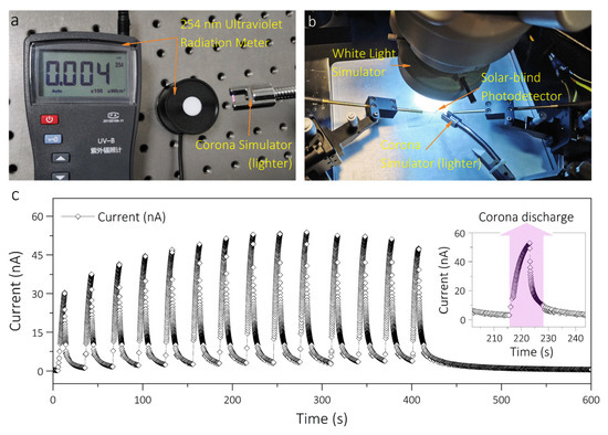 Corona discharge detection is an important application for solar-blind ultraviolet photodetectors [4]. Owing to the existence of weak solar-blind signals in the exposed high-voltage cables and components, the Ga2O3 based photodetector can be placed further away from the arc for long-distance and wide-angle detection if stable and highly sensitive detection can be achieved. In order to explore the corona discharge detection capability of m-Ga2O3 PD, a simple corona discharge test system was constructed, as shown in Figure 6. Figure 6a shows the photograph of the intensity test of the ~254 nm deep ultraviolet light generated by the corona simulator (lighter). The radiometer shows that the intensity was only 0.4 μW/cm2. As shown in Figure 6b, the corona detection environment was simulated under sunlight, and the photoresponse of m-Ga2O3 PD is shown in Figure 6c. When the lighter was discharged, the device responded repeatedly with a photocurrent signal of about 30~50 nA. Such result indicates that the solar-blind ultraviolet photodetector based on m-Ga2O3 film had significant sensitivity and has potential applications in high-voltage corona discharge and other fields.