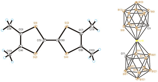 Transition metal bis(dicarbollide) complexes [3,3′-M(1,2-C2B9H11)2]− (M = Fe, Co, or Ni) are of great interest as counterions for the synthesis of TTF-based molecular conductors due to the unique high stability, possibility of tuning the charge and nature of the metal, and wide range of options for modification with dicarbollide ligands via hydrogen substitution by other atoms and functional groups [5,6]. Although most of the compounds studied were BEDT-TTF-based radical-cation salts, recently, we have synthesized radical-cation salts based on such unconventional and rather exotic donors as bis(1,3-propylenedithio)-tetrathiafulvalene [8,9], dibenzotetrathiafulvalene [10], and 4,5-ethylenedithio-4′,5′-(2-oxa-1,3-propylenedithio)-tetrathiafulvalene [9]. On the other hand, although compounds of the composition (TMTXF)2Y (X = T, S) are usually classical organic metals among which the first organic superconductors were discovered [4,7], and TMTTF and TMTSF radical-cation salts continue to attract the attention of researchers [11,12,13,14,15], very little attention has been paid to TMTTF and TMTSF radical-cation salts with metallacarborane anions [16,17,18,19]. This prompted us to prepare and investigate new TMTTF and TMTSF radical-cation salts with metallacarborane anions.