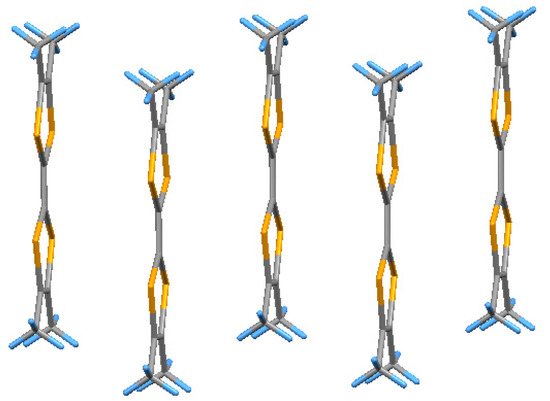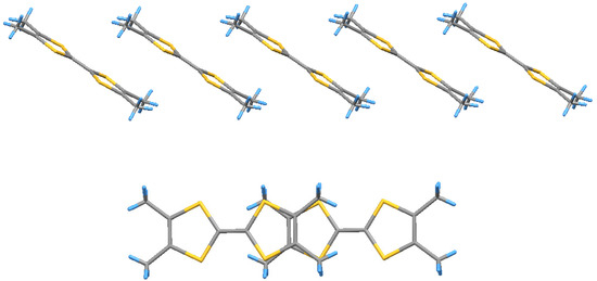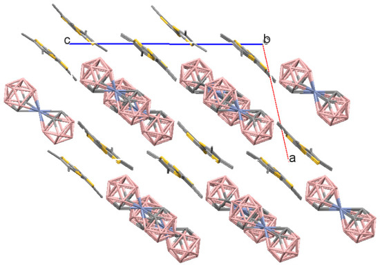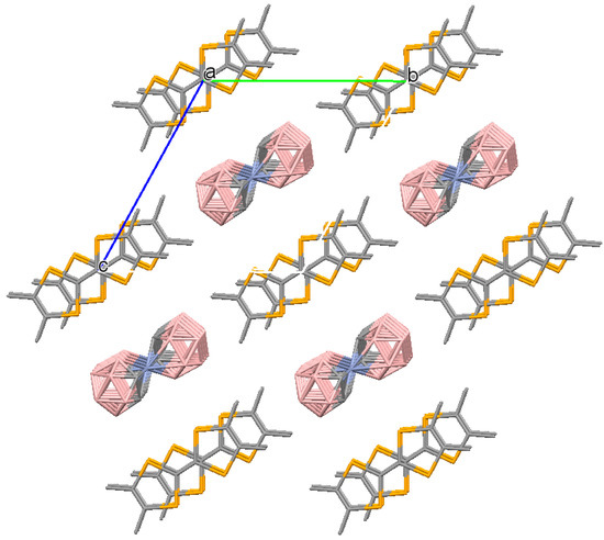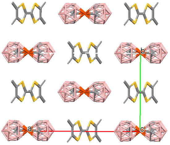 The (TMTSF)2[3,3′-Cr(1,2-C2B9H10)2] (3) crystals are isostructural to (TMTSF)2[3,3′-Co(1,2-C2B9H11)2] and (TMTSF)2[3,3′-Fe(1,2-C2B9H11)2] salts studied earlier, containing cobalt and iron bis(dicarbollide) anions [18,19]. The crystal structure of 3 is formed by the TMTSF cation in a general position and the [3,3′-Cr(1,2-C2B9H11)2]− anion in a special centrosymmetrical position (Figure 6). Compound 3 possesses a structure (Figure 7 and Figure 8) where the TMTSF+• radical-cations and anions form staggered stacks. The distances between the averaged planes of the TMTSF donors in the dimers are 3.70 and 3.73 Å, and the dihedral angle between the planes is 0° by symmetry conditions.