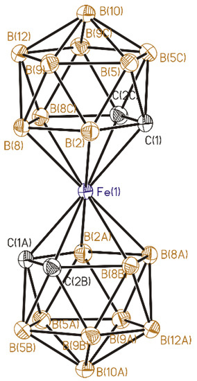 The Fe-C and Fe-B bond lengths are 2.0790(9)–2.1001(8) and 2.1001(8)–2.1494(8) Å, correspondingly, and the overlapping values are due to the statistical disordering of carbon and boron atoms in the dicarbollide ligands. The distances from the iron atom to the C2B3 faces of the dicarbollide ligands are equal to 1.53 Å, which is close to the distances in analogous salts of the iron bis(dicarbollide) anion [19,24,25]. The dicarbollide ligands are turned relative to each by 180°, forming the transoid conformation. The C2B3 faces are parallel by symmetry conditions.