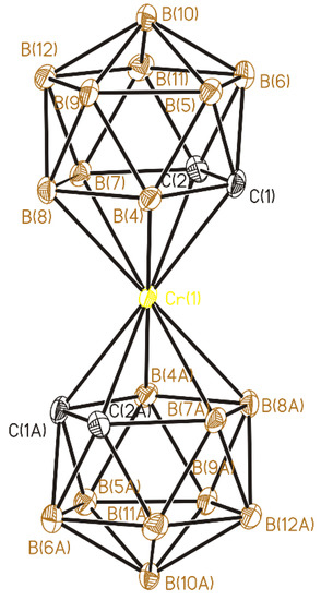 The Cr-C and Cr-B bond lengths are 2.173(2)–2.180(2) and 2.232(2)–2.279(2) Å, correspondingly. The distances from the chromium atom to the C2B3 faces of the dicarbollide ligands are equal to 1.68 Å, which is close to the corresponding distances found in the structures of Cs [3,3′-Cr(1,2-C2B9H11)2] [20], (TTF)[3,3′-Cr(1,2-C2B9H11)2] [21], and (BEDT-TTF)2[3,3′-Cr(1,2-C2B9H11)2] [22,23]. The dicarbollide ligands in the [3,3′-Cr(1,2-C2B9H11)2]− anion are turned relative to each other by 180°, forming the transoid conformation. The C2B3 faces deviate slightly from parallel, being inclined by 178.7° to each other.