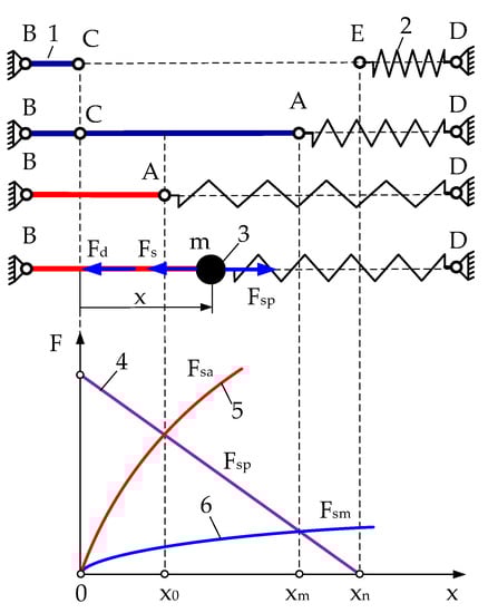 If a voltage is applied to the SMA wire at points A and B, the passing through the wire current leads to a gradual increase in its temperature, as a result of which the SMA wire crystal structure changes from martensite to austenite, leading to a gradual increase in the wire Young’s modulus. As a result of these processes, spring starts to lengthen and point A moves from position xm to x0. The hardening forces the SMA wire to recover its original shape, which is its original undeformed length. The coordinate x0 is the equilibrium position of the wire in the austenitic state corresponding to the maximally stretched spring. Once this coordinate is reached, the rise in wire temperature does not change the displacement of point A because the final austenitic temperature is reached. The whole volume of the wire is transformed into austenite, and after reaching this temperature, there are no structural-phase changes. After the voltage is switched off, the wire gradually lowers its temperature, turns into martensite and returns to the maximum stretched position corresponding to the point xm.