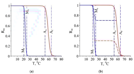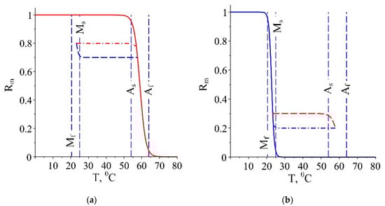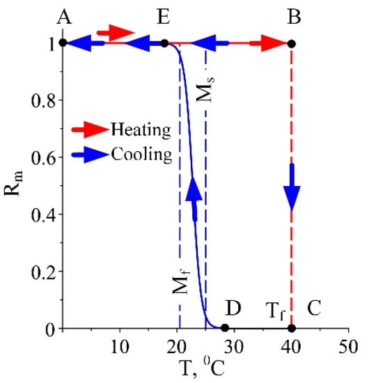The behaviour according to the improved model (40)–(43) is presented in Figure 3 by the line BA (blue arrows), which presents a realistic change of the temperature for this case. A similar discontinuous function for Rm can be considered if cooling from a temperature T > Af is present and for a heating appears.