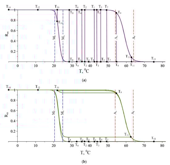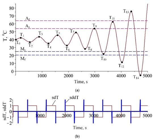 The temperature fluctuations occur when heating changes with cooling and vice versa. In Figure 5a, these fluctuation points correspond to the local temperature extremums denoted by Ti (i = 1, 2, …, 14). A numerical algorithm for determining the fluctuation points is developed, and the results are depicted in Figure 5b. According to the algorithm, the sign of the temperature derivative as a function of time is calculated by the function and its values are ±1. An additional function that successively finds the differences of two adjacent signums of the temperature derivatives indicates that a fluctuation occurs if it obtains a value of ±2. Depending on where the point of the temperature fluctuation is, the appropriate equation for calculating the relative martensitic fraction is applied. The two graphs in Figure 6 show both cases for possible calculations of martensite fraction. If the model (36) is used (Figure 6a) it can be distinguished 10 cases of jump points. The relative martensite fraction is a smooth function only for the points T12 ÷ T14 which lies outside the temperature interval [Mf,Af]. In Figure 6b, the points obtained using the improved model are shown. As one can see, the degenerated hysteresis loop appears for points T0 ÷ T8. Points T9 and T10 describe a sub minor hysteresis loop, and a minor loop starts from point T11.