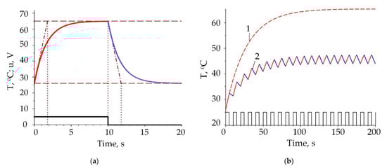 Figure 7b shows the time evolution of the temperature of the wire at a frequency of f = 0.1 Hz, z = 0.5, R = 200 Ω, cp = 900 J/(kg·°C), hc = 18 W/(m2·°C). The dashed line (pos.1) depicts the temperature time evolution without using PWM. As can be seen, the temperature reaches its limit value (19). In the same graph, the temperature when PWM is applied is shown (pos.2). The parts of the curve in which the wire is heated are shown in red, and the parts in which the cooling is performed are shown in blue. The limit temperature (19) cannot be reached when PWM is used due to cooling sections depending on duty cycle value. Maximum wire temperature and temperature increasing rates are controlled by changing the duty cycle value, which can improve the control of the actuator, especially in cases where a smoother operation is required. The limited cooling rate is a major factor that limits the actuator’s performance [].