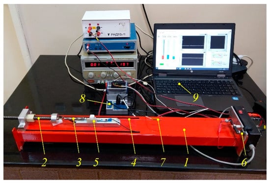 The experimental studies of the SMA actuator are conducted using an original experimental setup [,], shown in Figure 8. Its functionality allows the measurement of the SMA wire’s force, temperature, and displacement as a function of time. The experimental setup design with PWM regulated temperature tests wires with different diameters and lengths, creating different pre-tension forces.