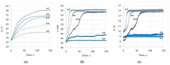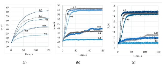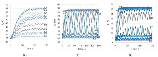 Figure 9 shows the experimentally obtained graphs for the wire’s temperature, force, and displacements for a duty cycle variation in the range of 0.1 ÷ 0.9 for PWM frequency f = 0.1. Analysis of the presented in Figure 9a results for the temperature show that the increase in the duty cycle value leads to a rise in the temperature of the SMA wire. For every duty cycle value, the rise in the temperature in time is exponential, as suggested by (17). Periodic temperature fluctuations with the frequency of PWM and variable amplitude are present due to the heating and cooling of the wire. A temperature jump is present during the transition from the duty cycle value of 0.4 to 0.5, suggesting a nonlinear relationship. When the duty cycle value increases after 0.8, the temperature does not rise anymore, and the tendency is to be equal to the limit temperature. The displacement and force results, shown in Figure 9b,c correspondingly, have a similar character. The fluctuations of the displacement are maximal at a value 0.4. Increasing the duty cycle value from 0.1 to 0.4 leads to an increase in displacement of about 5 mm. Increasing the duty cycle value to 0.5 results in a jump in the displacement of about 8 mm, and a further increase to 0.9 practically does not causes an increase in the displacement. It can be concluded that a relatively accurate displacement with a small amplitude of fluctuations by changing the duty cycle value can only be maintained in the range of very low (0.1 ÷ 0.2) or very high (0.7 ÷ 0.9) values of the duty cycle, with the corresponding displacement of 42 mm and 57 mm. Stable constant intermediate displacement values were impossible to obtain by setting a constant duty cycle value. Similar conclusions can be made about the SMA wire force—by changing the duty cycle value, it is possible to obtain constant values of the SMA force about 9 N or about 15 N. Figure 10 and Figure 11 show similar graphs for PWM frequency values equal to 1 Hz and 10 Hz correspondingly. As one can see, the amplitudes of fluctuations are very small, and the laws of change of the temperature, displacement and force are similar to the already discussed graphs in Figure 9.
