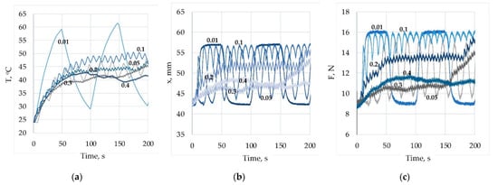 In Figure 12, the change in temperature, displacement and force for duty cycle value of z = 0.5 and different PWM frequencies—from 0.01 Hz to 0.4 Hz—are shown. Each graph is labelled with the PWM frequency at which the corresponding graph is obtained. At a frequency of 0.01 Hz, the exponential nature of the wire temperature during heating and cooling is visible. At all frequencies, there are fluctuations in the temperature, and with the increase in the frequency, the amplitude of the fluctuations decreases. For all cases, the average temperature is about 43 °C, indicating that this average temperature can be maintained at any frequency but with varying degrees of deviation due to the periodic fluctuations. In the same figure, the corresponding graphs of the displacement are shown. At a frequency of 0.01 Hz, the average displacement value is 50 mm, and its variation is between 42 and 57 mm. At a frequency of 0.1 Hz, the displacement variation is much smaller, but the average displacement value is about 55 mm. The graph for the force has a similar character.