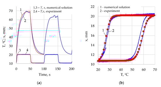 The validation of the developed mathematical model (13) is performed by comparing numerical and experimentally obtained results. Figure 13a shows theoretical and experimental results for the temperature and displacement for duty cycle value 0.5 and PWM frequency equal to 0.01 Hz. By positions 1 and 3, the theoretical values of the temperature and displacement correspondingly, computed using the system (13) are denoted. By positions 2 and 4, the experimental values of the temperature and displacement correspondingly are denoted. Analysis of the similarity of the graphs shows an accurate enough degree of coincidence. This is also confirmed by the hysteresis shown in Figure 13b, in which the double loop shows differences for the two illustrated cycles. The differences between the graphs can be explained by insufficiently accurate identification of the numerical values of the parameters, as well as by the significant sensitivity of the system to some factors not included in the mathematical model or whose influence cannot be predicted, mainly—the presence of random airflows, imperfections in the design of the experimental setup and constantly changing environmental conditions during the experiment. The influence of the thermocouple on the temperature measured is minimized using a thermocouple whose dimensions are close to the diameter of the wire [].