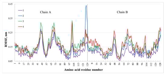 Based on the results of the MD simulation, the graphs of the mean square fluctuations of Cα atoms (RMSF, Figure 1) were plotted, from the comparison of which it is noticeable that curve 1, corresponding to the dimer model considering all precipitant ions, lies below the rest. This indicates the relative stability of this model. In Figure 1, the biggest difference in RMSF values (in the range from 0.15 to 0.27 nm) between different models is observed in the region of amino acid residues GLY126, CYS127, ARG128, LEU129, and GLY102 of the chain A. We note that these residues are located on the surface of the protein molecule, but do not participate in the formation of covalent or hydrogen bonds between monomers; the residue LEU129 is the terminal in the polypeptide chain, and GLY126, CYS127, and ARG128 are placed next to it. The RMSF value of the dimer averaged over all Cα atoms, modeled without Na and Cl ions both in the solution and in the protein structure, is 0.16 nm. When a precipitant is presented only in the solution (0.4 M), it is 0.15 nm; when the precipitant is in the solution and the built-in ions of Na or built-in ions of both Na and Cl are considered, it is 0.14 and 0.12 nm, respectively. Consequently, the more precipitant ions are accounted for in the simulated system, the more stable the dynamics of the dimer in the solution and less flexible its structure, since the RMSF values of its atoms decrease.