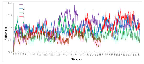 RMSD graphs of Cα atoms of different models of dimers simulated in a solution with a precipitant: with Na and Cl ions, bound to the protein (1), only with Na ions in the dimer structure (2), and without precipitant ions embedded in the lysozyme molecule (3), as well as without Na and Cl ions both in solution and in the protein structure (4).