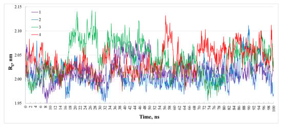 Graphs of the gyration radii Rg of Cα atoms of different models of dimers simulated in a solution with a precipitant: with Na and Cl ions bound to the protein (1), only with Na ions in the dimer structure (2) and without precipitant ions embedded in the lysozyme molecule (3), as well as without Na and Cl ions both in solution and in the protein structure (4).