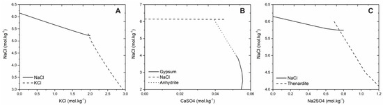 Phase diagrams for the aqueous ternary system at 25 °C: (A) NaCl–KCl; (B) NaCl–CaSO4; and (C) NaCl–Na2SO4.