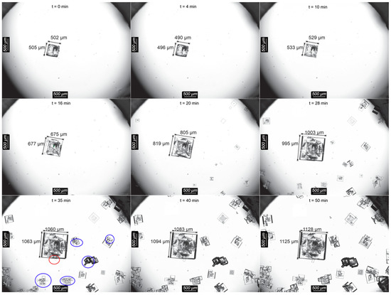 Optical photomicrographs along time of the NaCl–KCl–H2O droplet under evaporation seeded with NaCl. A crystal growing on the surface of the seed is surrounded with the red circle at the frame t = 35 min. Blue circled crystals indicate other possible epitaxially grown crystals.