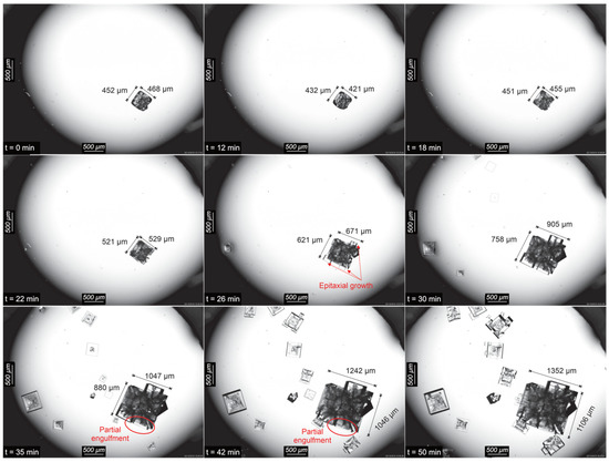 Optical microscopy images obtained in situ during crystallization of the ternary system NaCl–KCl–H2O seeded with KCl are shown in Figure 5. During the first 12 min of crystallization, a slight dissolution of the seed crystal took place. Thereafter crystal growth healed the edges of the seed crystal. At 18 min, the surface started to develop roughness which became visibly new crystals at 22 min. After 26 min, crystals start growing on the surfaces of the KCl seed. These nucleation events are possibly epitaxial, visible in the photomicrographs and confirmed through EDS analysis. Between 35 and 42 min of crystallization, the crystals that were formed in opposite sides of the seed crystal surface (marked with a red circle in Figure 5) reached one another at the center of that surface and seemed to partially engulf the KCl seed.