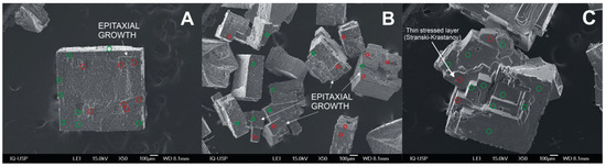 Epitaxial deposits without crystallographic orientation with respect to the seed crystal, were seen in both the NaCl–KCl–H2O and NaCl–Na2SO4–H2O systems. This is compatible with the 3D island growth mechanism proposed by Stranski–Krastanov [12,38], which is expected for a mismatch between the crystal lattice constants of 15% or less [42,43]. NaCl is seen to grown on the (111) face of Na2SO4 (thenardite), which belongs to the orthorhombic crystal system. Hence, the lattice mismatch can be evaluated considering the interatomic distances between the atoms on this face (Figure 7C), as there seems to be higher coherence between NaCl (100) face and Na2SO4 (111) face. However, when comparing lattice parameter pairs, only one of the thenardite constants (a = 5.7236 Å) differ (slightly) from the NaCl’s constant. In their study on epitaxy-nucleated crystals over crystalline surfaces, Mithen and Sear [24] report that oriented epitaxy relies on the coherence of the lattice parameters, i.e., crystal lattices of the nucleus and the substrate closely match. Yet, epitaxial formations were still seen in this study—although not oriented—despite poor matching between most of the lattice parameters. On the other hand, this observation agrees with Pashley’s [18] reports for epitaxial thin film surfaces that the low misfit value, although significant under certain conditions, is not an essential criterion for epitaxial growth. Sarma et al. [44] studied the crystallization of several pairs of organic compounds over different inorganic crystals with well-defined crystallographic planes and found little correlation between lattice matching, epitaxy and preferred nucleation orientation. They concluded that when it comes to epitaxy, multiple mechanisms take place and that intermolecular forces as well as growth anisotropy also play a role.