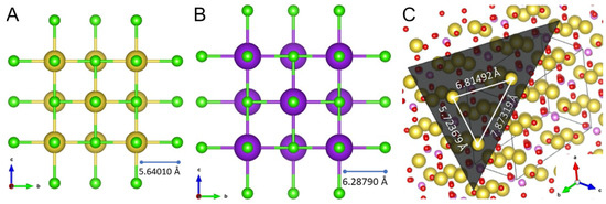 Projection of (100) planes of (A) NaCl, (B) KCl, and (C) plane (111) of Na2SO4 with Na depicted in yellow, K in purple, Cl in green, S in pink and O in red. Lattice parameters taken considering room temperature and pressure [37]. Projections made with VESTA software [39].