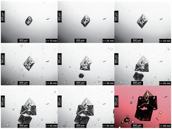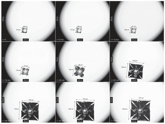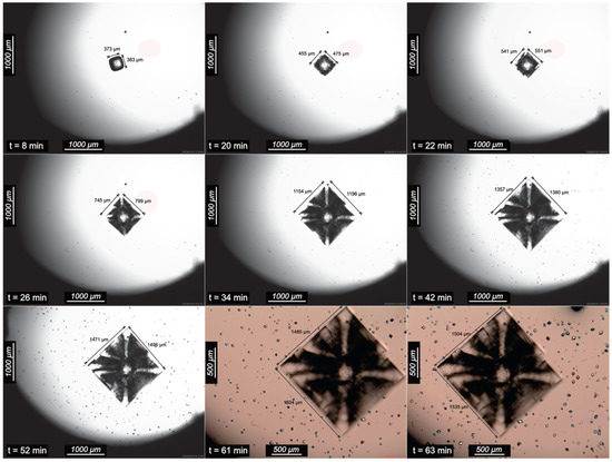 Images of the NaCl–KCl–H2O system seeded with NaCl are displayed in Figure 4. The seed presents abundant fluid inclusions, noticeable as dark spots in the crystals [6]; it underwent slight dissolution at the beginning of the experiment, evidenced by a small decrease in size in the first minutes. After 10 min, the NaCl seed crystal started to grow, developing smooth surfaces, well-formed edges, and cubic habit. Around 20 min after the evaporation started, several individual crystals appeared in the droplet. This nucleation event is probably heterogeneous, triggered by factors such as nano-impurity particles in solution, phase boundaries [31] and local supersaturation spots. These new crystals developed hopper habits, indicated by the smooth square-ring on the border and fluid inclusions distribution, suggested by the dark spots in their center. The emergence of such crystals is unwanted, as they consume supersaturation and interfere with the epitaxial phenomena around the seeded crystal. The control of the supersaturation, although desirable, is unfeasible in ternary solutions of highly soluble salts undergoing simultaneous crystallization. Simultaneous crystallization can only happen in the eutonic point, an invariant combination of the concentration of both salts, temperature, and pressure, with no degree of freedom. Highly soluble inorganic salts have very narrow metastable zones, leaving no room to adjust supersaturation levels. Hence, the slightest amount of water evaporation induces crystallization almost immediately and maintains the solution at the eutonic concentration [5]. For this reason, instead of controlling supersaturation, we turned our efforts to maintain the same evaporation rates in all experiments. By keeping constant evaporation rates and both compounds close to saturation levels, the residual supersaturation of each salt can be approximated as the driving force for its respective crystallization.