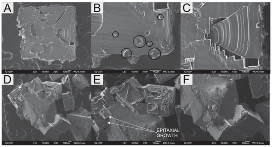 SEM image of (A) the NaCl seed grown after 63 min on the NaCl–Na2SO4–H2O droplet under evaporation; (B) Na2SO4 crystals on the seed surface; (C) a hopper cavity of the seed crystal; (D) Na2SO4 seed grown after 58 min on the NaCl–Na2SO4–H2O droplet under evaporation; (E,F) epitaxial formations of NaCl crystals on top of the Na2SO4 seed.