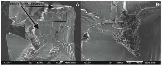 Even though during evaporation the solution became supersaturated with respect to anhydrous CaSO4, which crystallized, calcium sulphate crystals are not visible through optical microscopy. SEM-EDS image displays the NaCl seed (Figure 12A); its face central cavities can be clearly observed, as well as a step-like-structure, comprising the inner (hollow) walls of the cavity. Two of the edges are seen broken because, due to hopper growth, edges are thin and fragile. Calcium sulphate in solution was reported to interfere with the growth of NaCl by Zago et al. [4,7]. In their work, evaporation was performed at 110 °C and hopper growth was also observed, as well as more prominent fluid inclusions in the product. CaSO4 was also related to increased roughness on NaCl crystal surfaces.
