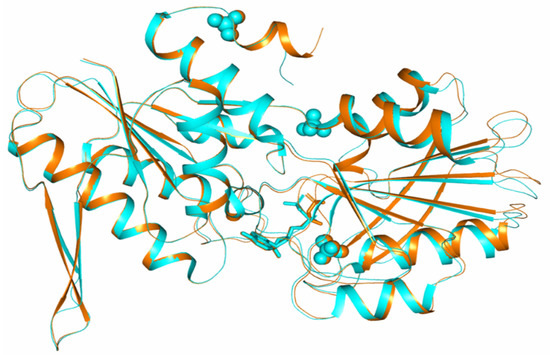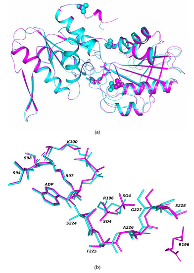 The crystal structure (space group R32-h) was refined at the resolution of 1.85 Å. The refined coordinates (REFMAC program [21]) of the atomic model were deposited in the PDB, PDB_ID: 7PN0. In both structures, ADP molecules and sulfate ions bounded with the enzyme are localized on the electron density map. The statistics of the X-ray diffraction set and the refinement of the structure are given in Table 1. A fragment of the electron density map is shown in Figure S1.