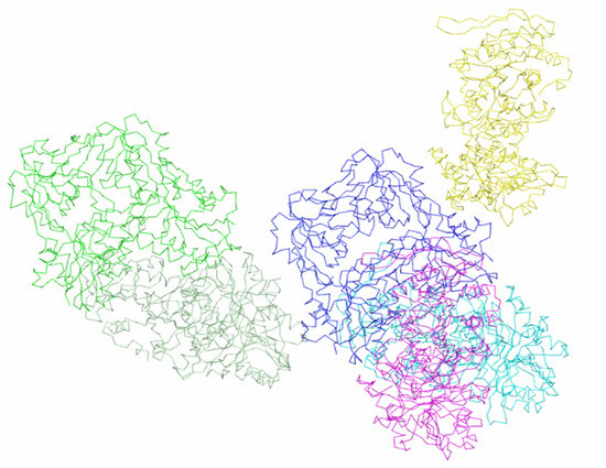 Hexameric enzyme molecule and subunits of symmetric related molecules in contact with it in the crystalline modification P41212.