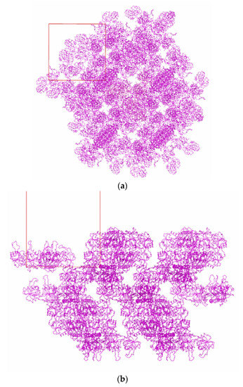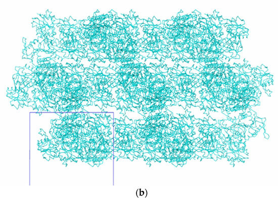 Figure 6 and Figure 7 show the packing of Tth2PRPPS HB27 molecules in crystal modifications P41212 and R32-h. In the crystal structures of both modifications, there are channels along the c axis (Figure 6a and Figure 7a). In rhombohedral crystals, such channels are absent, and enzyme molecules in the crystal structure form a layer perpendicular to the c axis.