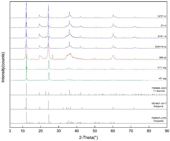 The XRD patterns of the seven selected serpentine minerals with standard XRD patterns are shown in Figure 1. The samples DWH14-lz, ZH-41-lz, Z-3-lz, and SZ-17-lz have patterns identical to that of PDF 86-0403, strong peaks at d(001) = 12.079–12.099° and d(002) = 24.301–24.340° and medium intensity peaks at d(−1–11) = 35.861–35.919°, which is the characteristic pattern of lizardite-1T. The sample SM-ctl has a pattern identical to that of PDF 27-1275, showing strong peaks at d(002) = 12.020° and d(004) = 24.300°, which is the characteristic pattern of chrysotile. The pattern has fewer but wider peaks and the shape of the peak at d(020) = 19.500° is asymmetric. The samples H7-atg and H11-atg have patterns identical to that of PDF 07-0417, which is the characteristic pattern of antigorite. The patterns are clear and strong (the weak peak is not obvious after normalization), with strong peaks at d(001) = 12.159–12.160° and d(002) = 24.580–24.599°. There is a double peak near d(−131) = 35.500–35.520° and d(211) = 37.022–37.043°. All of the samples were found to be almost pure minerals without any other phases.