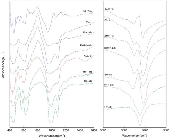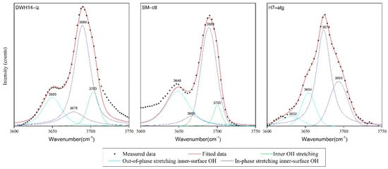 Infrared spectroscopy is a powerful tool for quickly identifying different types of clay minerals. The IR spectra of phyllosilicates have been summarized by Farmer []. Serpentines exhibit νOH (OH-stretching) bands in the range 3650–3700 cm−1 and δOH (OH-vibrating) bands near 618 and 646 cm−1, due to their inner and surface hydroxyls []; however, there is no specific distinction between the peaks of the inner and surface hydroxyl groups. Cheng et al. [] measured and distinguished five phyllosilicate minerals using near-infrared spectroscopy, including pyrophyllite, muscovite, talc, chrysotile, and kaolinite. Li et al. [] analyzed the near-infrared spectra of different types of silicate minerals and concluded that there were different types of combined frequency and double-frequency peaks for water in gem minerals. Zhang et al. [] compared TO- and TOT-type layered silicates and found that layered silicates have a long hydrogen bond, which widens the stretching vibration band of O-H, shifts the band in the direction of the long wave, and sometimes causes double-peak phenomenon to appear. The stretching frequency of the hydroxyl group is also affected by the octahedral cation coordinated with the hydroxyl group.
