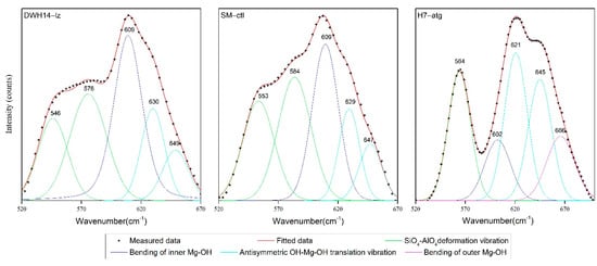 Bishop [] reported that the center of the OH bending vibrations were located at 606 cm−1 for chrysotile and at 625 cm−1 for lizardite. After fitting the peaks, it was found that the vibration peaks of the OH groups in the three types of serpentines were similar, with peaks at 609, 630, and 649 cm−1, but their strengths varied significantly. Figure 3 shows DWH14-lz, SM-ctl, and H7-atg as representative examples (the other samples have similar patterns). The inner OH bending vibration centers of lizardite and chrysotile are around 609 cm−1, 630 cm−1, and 649 cm−1, which are assigned to the OH translational vibration mode. In the range of OH stretching, for antigorite, the peak at 3674 cm−1 is stronger than the peak at 3693 cm−1, which are both assigned to the outer OH vertical stretching vibration. The opposite relationship occurs for those peaks in lizardite and chrysotile. Antigorite also lacks the peak near 3700 cm−1 that is assigned to the inner OH stretching vibration. Figure 4 shows DWH14-lz, SM-ctl, and H7-atg as representative examples (the other samples have similar patterns). The detailed peak positions and band assignments of the samples are presented in Table 2.