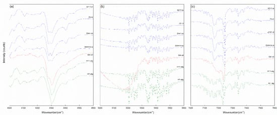 NIR spectra of the serpentine samples. (a) Range of the OH-combination bands (4000–4600 cm−1); (b) adsorbed water bands (5000–5600 cm−1); (c) range of the OH-stretching overtone bands (7000–7600 cm−1).