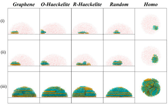 To investigate the effect of the substrate lattice structure on the polymorph of ice, MD simulations were employed to study the ice formation process on different substrates: Graphene, Oblique-Haeckelite (O-Haeckelite), Rectangular-Haeckelite (R-Haeckelite), and a Random carbonaceous substrate. As shown in Figure 2, consistent with previous reports [20,22,33,34], after an induction period (during which, the small water clusters with ice structure formed and then disappeared quickly, due to the thermal fluctuation of system), stable ice nuclei (larger than critical size Rc of ice) formed at the water-substrate interface for the systems of Graphene, O-Haeckelite, R-Haeckelite, and Random, which should be due to the much lower heterogeneous nucleation barrier. For these heterogeneous nucleation systems, especially for the nucleation stage, the ice crystals exhibit a single-crystal-like structure with barely any grain boundary, which is due to the 1-dimensional structure match (in the direction perpendicular to the substrate surface) between a flat substrate and a flat crystalline face of ice. While for the Homo system, the new-formed ice exhibits a polycrystalline structure.