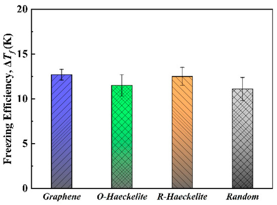 To further investigate the effect of substrate lattice structure on heterogeneous ice nucleation, freezing efficiency of the substrates, based on the method of Lupi et al. [20], were calculated (shown in Figure 4). It follows that the calculated freezing efficiencies for Graphene, O-Haeckelite, R-Haeckelite, and Random substrates are 12.7 ± 0.6 K, 11.5 ± 1.2 K, 12.5 ± 1.0 K, and 11.1 ± 1.3 K, respectively, which are consistent with the previous reports that the crystallization temperature of ice on the graphite surface is 12 ± 3 K higher than the temperature of homogeneous ice nucleation [20,21]. The freezing efficiency of these different substrates has no significant difference, indicating that, although the substrates exhibit different polymorph selectivity of ice, the heterogeneous nucleation promotion effects of the substrates on ice are similar. Moreover, it should be pointed out that the heterogeneous nucleation promotion effect changes with the system temperature [24]. To calculate the freezing efficiency, the system temperature is steadily decreased. The freezing processes are driven by a very high supercooling, which can reduce the heterogeneous nucleation promotion effect. For instance, the heterogeneous ice nucleation rates on different substrates exhibit significant differences only when the system temperature increased to as high as 235 K [24]. Thus, for a systematic study, e.g., heterogeneous nucleation barrier and heterogeneous nucleation rate, it is necessary to gain more accurate results by taking into account the influence of temperature. Another thing that needs to be specified is that, in our results, the calculated homogeneous nucleation temperature of ice is 1.6 K higher than that in the previous report [20], which can be attributed to the difference in the number of water molecules between this work and the previous report (refer to Figure S2). According to classic nucleation theory (CNT), the greater the number of water molecules in the system, the greater the nucleation probability of ice formation is, which could lead to this 1.6 K discrepancy.